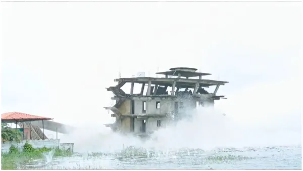 చెరువులో బహుళ అంతస్తుల భవనం ఉండడంతో అధికారులు బాంబులు అమర్చి కూల్చివేశారు. ఈ క్రమంలో శిథిలాలు ఎగిరిపడ్డాయి. అవి తగిలి హోంగార్డుకు తీవ్ర గాయాలు అయ్యాయి. వెంటనే ఆయన్ను ఆస్పత్రికి తరలించారు.