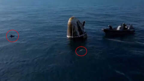 సముద్రంలో ల్యాండైన క్యాప్సుల్ను బోట్లోకి ఎక్కించేందుకు నాసా సిబ్బంది ప్రయత్నిస్తున్న సమయంలో డాల్ఫిన్లు దాని చుట్టూ చేరాయి. కాగా, క్యాప్సుల్ నుంచి వ్యోమగాములను బయటకు తీసిన సిబ్బంది అనంతరం వారిని హ్యూస్టన్లోని జాన్సన్ స్పేస్ సెంటర్కు తరలించారు. అక్కడ వారిని 45 రోజులపాటు పునరావాసంలో ఉంచుతారు.
